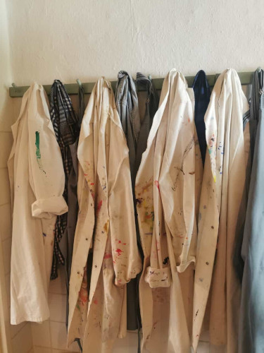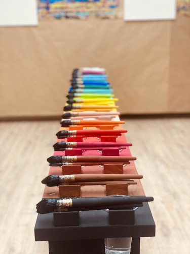 Das Setting mit seinem geordneten Tisch und 18 Temperafarben – frei von Giftstoffen und mischbar in unzähligen Varianten mit dazugehörigen Wasserbechern – und 3 hochwertigen Pinseln in zwei unterschiedlichen Stärken sowie Reißnägeln im Reißnagelbehälter ermöglicht allen Spielenden ein sofortiges Einzutauchen in das “Malspiel”. Das Bedürfnis, die aufdrängende Spur geschehen zu lassen, wird größer als Beabsichtigtes oder Vorgestelltes darzustellen.